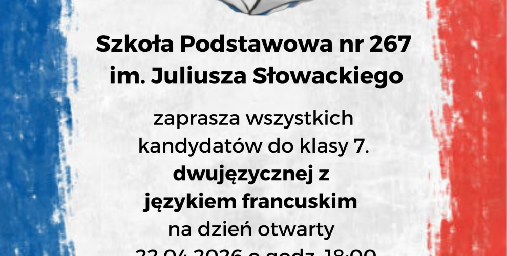 Szkoła Podstawowa nr 267 im. Juliusza Słowackiego zaprasza wszystkich kandydatów do klasy 7 dwujęzycznej z językiem francuskim na dzień otwarty. 📅 22.04.2026🕕 godz. 18:00 📍 ul. Braci Załuskich 101-773 Warszawa 📞 tel. 22 663 48 49🌐 sp267.waw.pl